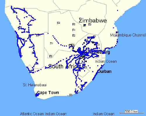 Irgendwie fühlte ich mich an den Vorfall auf der Magaben-Reise vor fast zwei Jahren erinnert, als ich eine Kuh anfuhr, die ich trotz guter Sicht und nicht übermäßiger Geschwindigkeit nicht gesehen hatte. Natürlich ist es reine Spekulation, von Angriffen der dunklen Mächte zu sprechen, wenn extreme Dummheit als Erklärung ausreichen würde.Interessant war nur, dass mir ein Mitglied unseres Forums am selben Abend in einem Internet-Chat erzählte, sie habe den Unfall vorausgesehen und versucht, mich zu warnen oder ihn anderweitig zu verhindern. Vielleicht verdanke ich ihr meine Wachsamkeit mein Leben. Wir bekamen über meine Versicherung einen Mietwagen (schneller und besser) und setzten die Reise mit einem bandagierten Kopf fort. (Dank eines freundlichen Passanten, der sich mit solchen Dingen auskannte)Wir verbrachten die Nacht in Trompsburg, ca. 90 km hinter Bloemfontein. Alles von Jo'burg bis einschließlich der Stadt Bloemfontein hatten wir bereits in der Vergangenheit abgeklappert, daher fingen wir erst jetzt an, TBs zu legen, sobald wir lohnende Ziele entdeckten. Davon gab es viele auf dieser wichtigsten Autobahn Südafrikas. (N1 von Johannesburg nach Kapstadt)