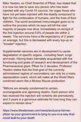 Mike Yeadon kann sicherlich nicht einfach als weiterer Verschwörungsfanatiker abgetan werden, da er der ehemalige Chefwissenschaftler des Impfstoffherstellers Pfizer war!