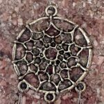Eine große Menge Rhodochrosit (mit der Traumfänger-Einlage) ist auf der Vorderseite des Orgonit-Steins eingebettet. Rhodochrosit wurde ausgewählt, weil er Selbstvertrauen, Leichtigkeit und Kompetenz fördert, aber auch, weil er lebhafte und intensive Träume hervorruft, an die man sich erinnern kann.