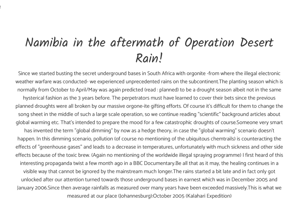 L'orgonite est à l'origine des plus fortes précipitations jamais enregistrées en Namibie grâce à l'« Opération Desert Rain ».