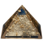 La Pyramide Or et Lapis en orgonite contient une pyramide intérieure qui est recouverte de feuille d'or. La pointe supérieure visible contient du lapis lazuli, souvent appelé la "pierre de vérité". Outre les 5 cristaux de quartz, une croix Muti (avec des herbes médicinales traditionnelles africaines) est sertie dans la base de la pyramide.